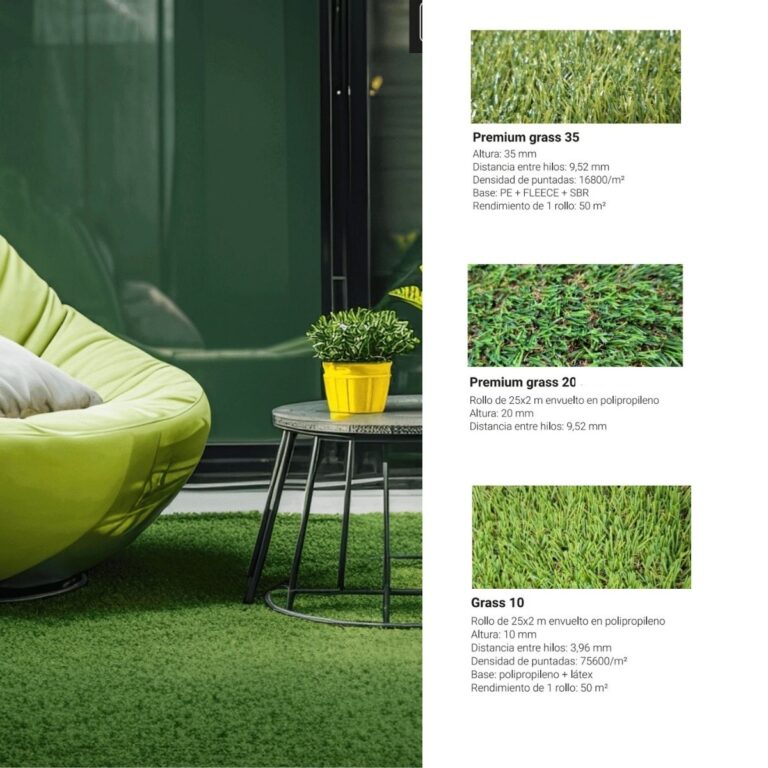 No necesita mantenimiento. No se riega. Se limpia facilmente. Resistente a rayos UV y al cloro. Autoextinguible. No propaga el fuego. Amigable con las mascotas.